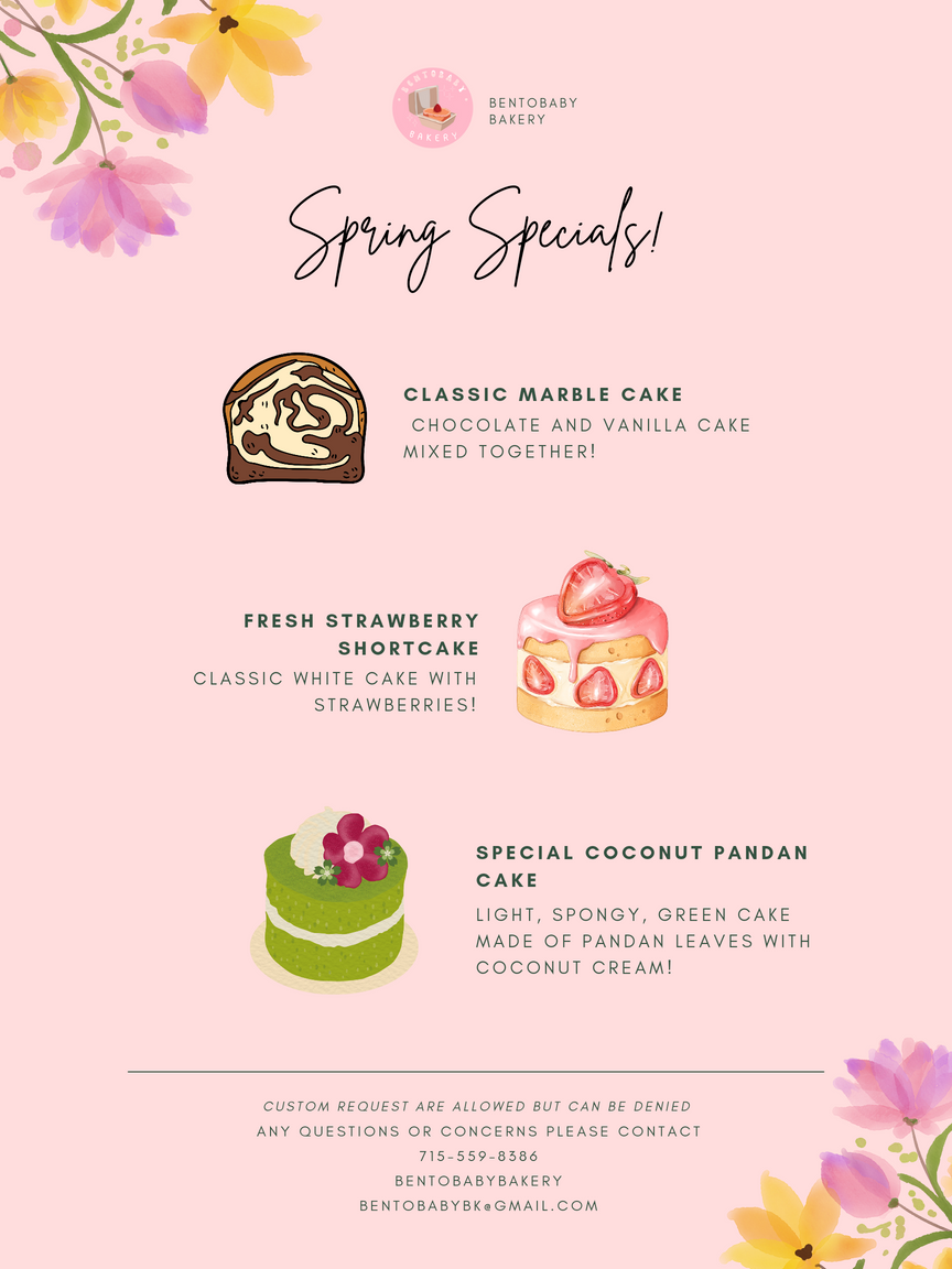 For these Spring Specials, I am exceeding for light, airy, and perfect balance of sweetness in these cakes! I am thinking of cold spring flowers that you could reminisce when you bite into it! These cakes will be absolutely delicious for the upcoming weather! Consider yourself one when the time comes, I can't wait!:)